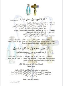 غيًب الموت ايزابيل سمعان ملكان باسيل ، ابنة عم رئيس مجلس الادارة المدير العام لمجموعة الوردية هولدينغ المهندس ايلي باسيل ، يحتفل بالصلاة لراحة نفسها عند الثالثة من بعد ظهر غد الخميس في كنيسة سيدة الدوير – الفيدار