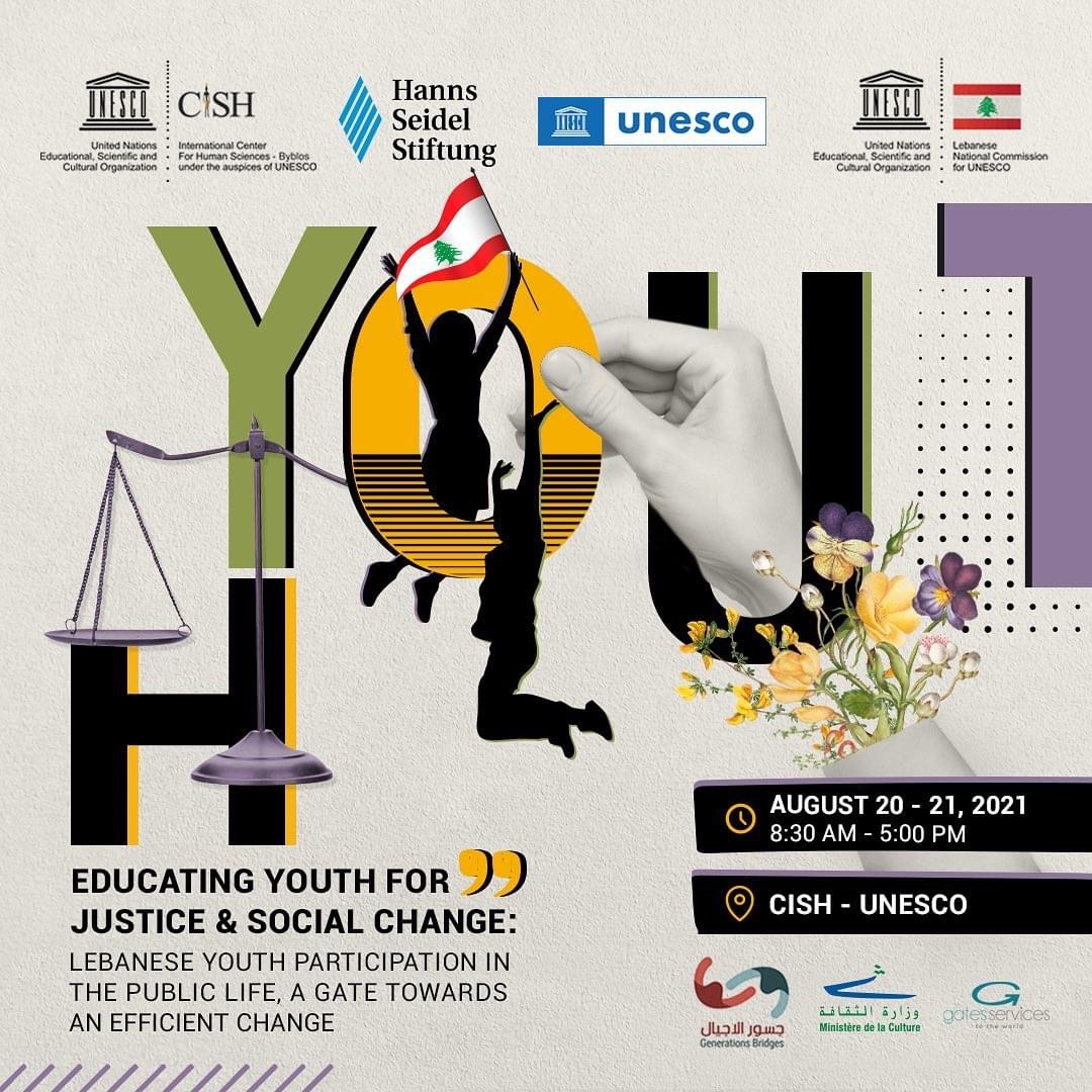 بمناسبة اليوم الدولي للشباب، ينظم المركز الدولي لعلوم الانسان اليونيسكو- بيبلوس سلسلة حلقات في ٢٠ و٢١ آب الجاري بالتعاون مع مؤسسة هانز سايدل ومكتب اليونسكو في بيروت واللجنة الوطنية لليونسكو وبالتنسيق مع جمعية جسور الاجيال بعنوان ” تثقيف الشباب من اجل العدالة والتغيير الاجتماعي:مشاركة الشباب اللبناني في الحياة العامة، سبيل الى تغيير فعال”.