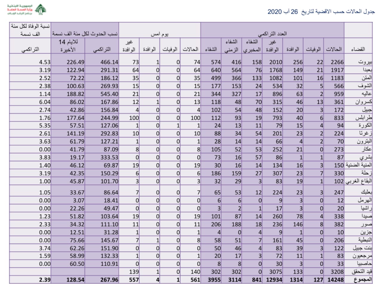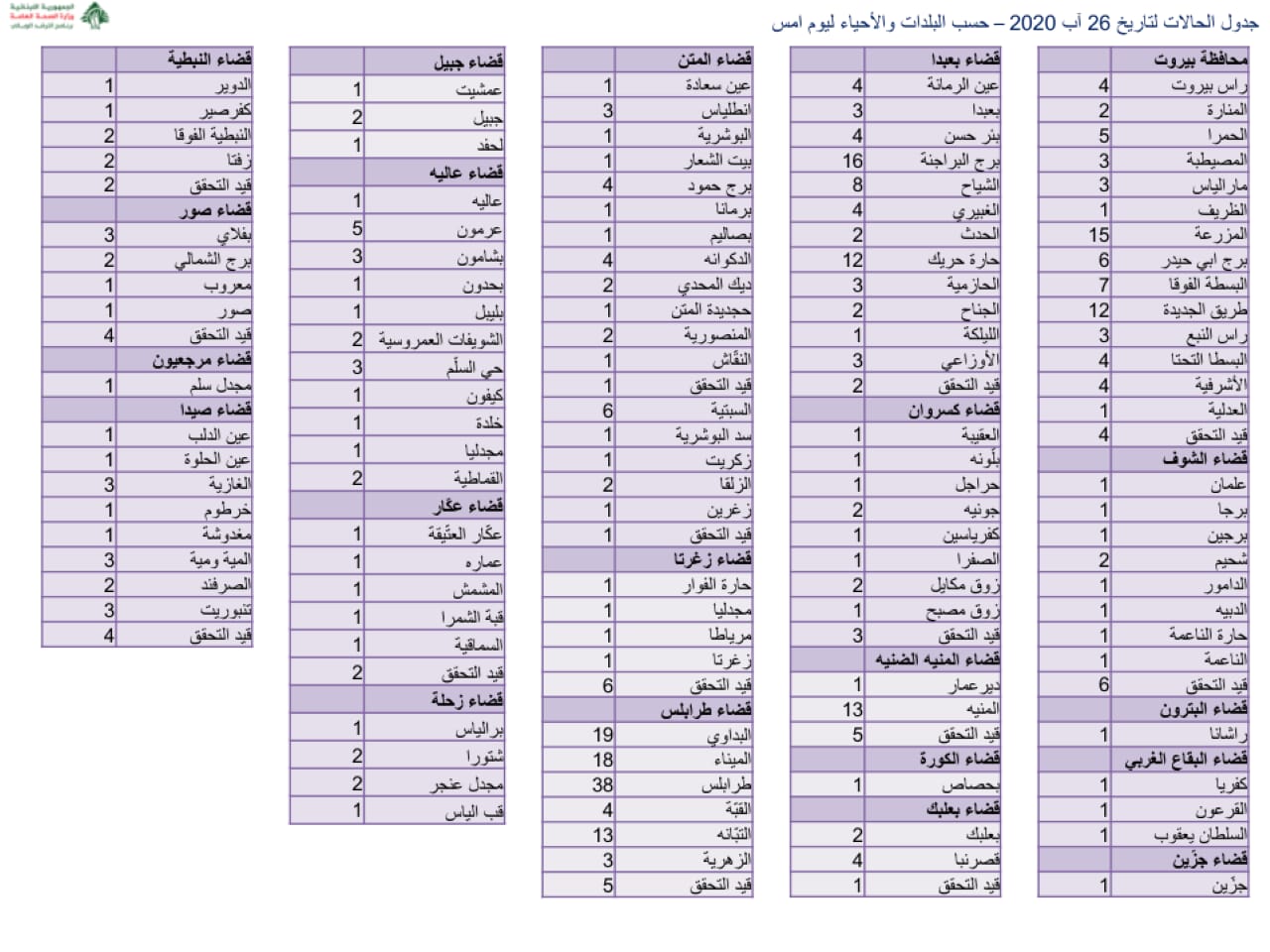 كما سجّل هذا الرقم على صعيد المحافظات إرتفاعات ظهرت حسب تقسيم المحافظات كما يلي: محافظة بيروت 9,82%، محافظة جبل لبنان 11,26%، محافظة الشمال 12,33%، محافظة البقاع 11,72%، محافظة الجنوب 10,50%، محافظة النبطية 13,69%”.