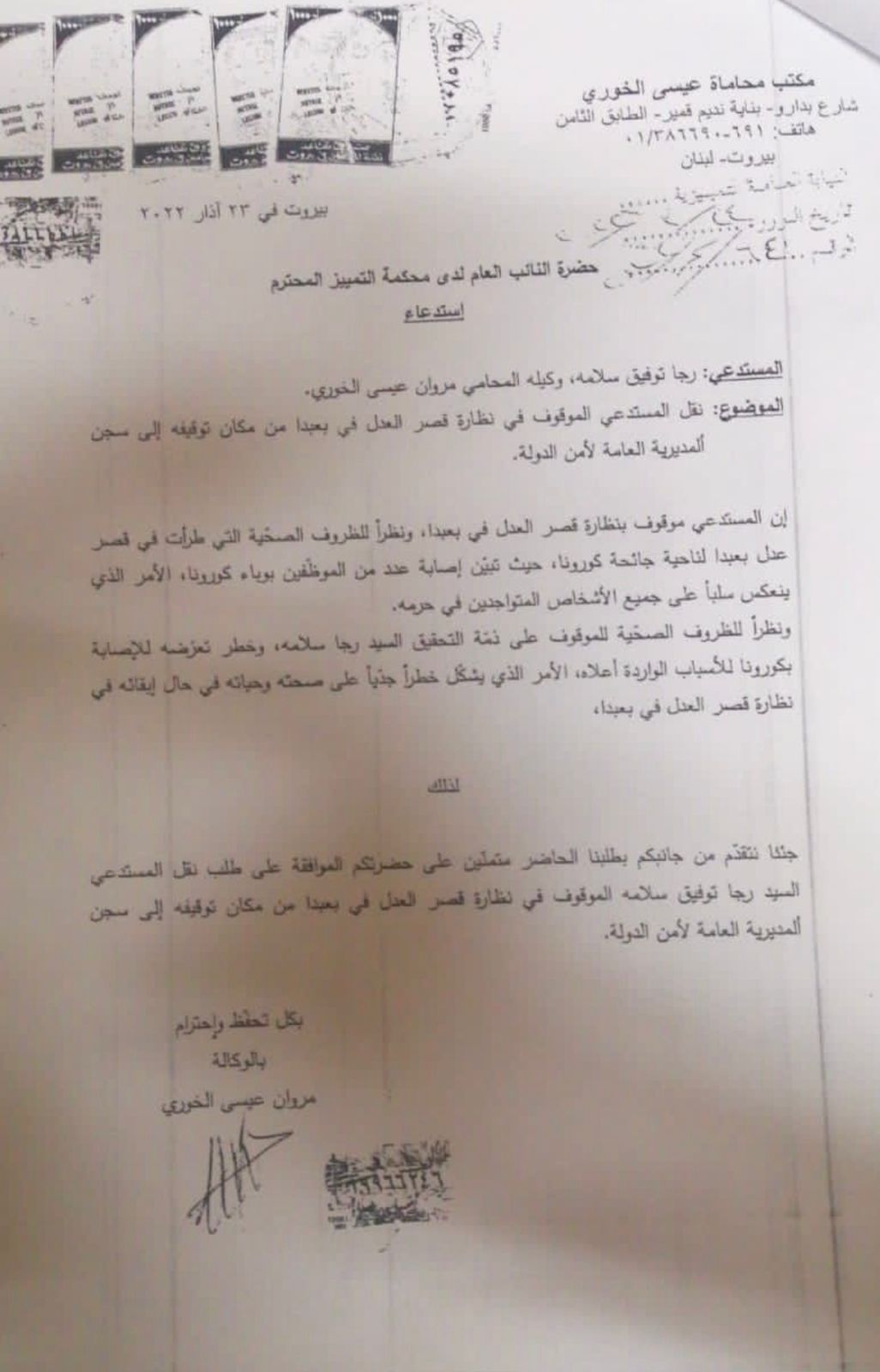تقدّم وكيل رجا سلامة، شقيق حاكم مصرف لبنان رياض سلامة، المحامي مروان عيسى الخوري، باستدعاء أمام النائب العام لدى محكمة التمييز، لنقل رجا سلامة، الموقوف في نظارة قصر العدل في بعبدا، من مكان توقيفه إلى سجن المديرية العامة لامن الدولة، وذلك نظرا للظروف الصحية التي طرأت في قصر عدل بعبدا لناحية كورونا، كما نظرا للظروف الصحية لسلامة على ذمّة التحقيق، وخطر تعرّضه للاصابة بكورونا للاسباب الواردة أعلاه، الامر الذي يشكل خطرا على صحته وحياته.