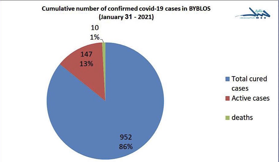 سجلّت مدينة جبيل منذ بداية انتشار فيروس كورونا لغاية تاريخ ٣١ كانون الثاني ٢٠٢١، ١١٠٩ حالة ايجابية، ١٠ منهم حالات وفاة، ٩٥٢ منهم شفاء تام، و١٤٧ شخص لا تزال حالتهم ايجابيّة، بحسب ما أعلنت بلدية جبيل-بيبلوس .