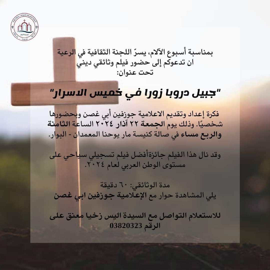 الى ذلك يعرض الفيلم عند الثامنة من مساء الجمعة ٢٢ آذار في كنيسة ماريوحنا المعمدان في البوار بدعوة من اللجنة الثقافية للرعية والدعوة عامة