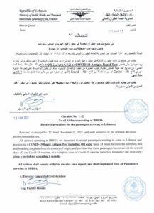 أصدر المدير العام للطيران المدني بالتكليف المهندس فادي الحسن تعميما الى جميع شركات الطيران العاملة في المطار حول الإجراءات المتعلقة بالركاب القادمين إلى لبنان.