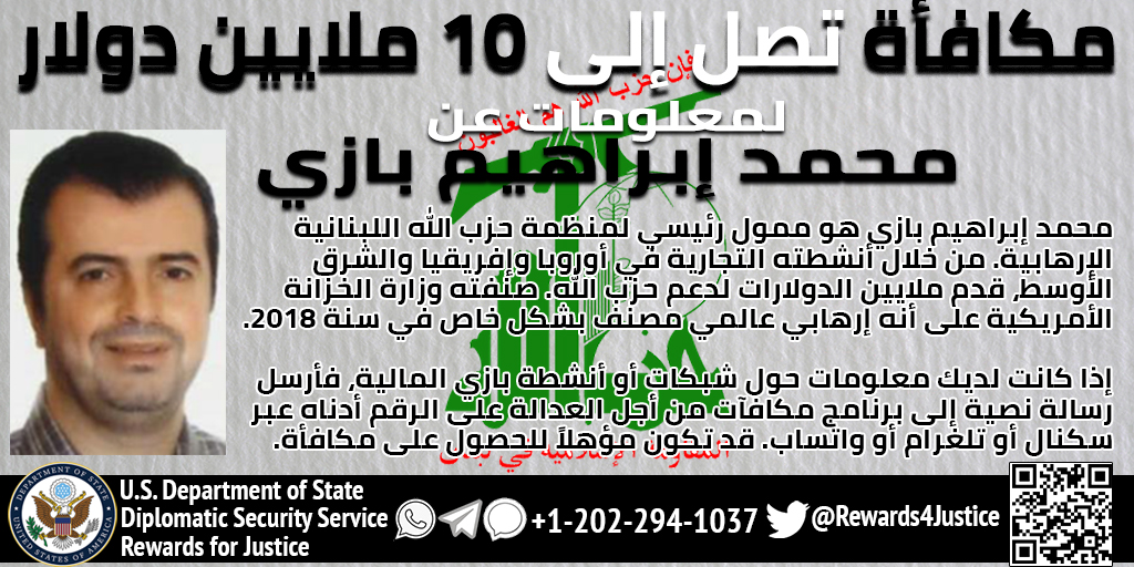 في سياق آخر تُواصل واشنطن مطاردتها “حزب الله” مالياً. ونشر امس الحساب الرسمي لبرنامج “مكافآت من اجل العدالة” التابع لوزارة الخارجية الأميركية صورة لمحمد إبرهيم بزي عبر “تويتر”. وعلّقت على الصورة بالقول “يستخدم محمد إبرهيم بزي انشطته التجارية الدولية لتوفير الملايين من الدولارات لحزب الله اللبناني. إذا كانت لديك معلومات عن شبكاته المالية، راسلنا عبر سكنال أو تلغرام أو واتساب على الرقم 0012022941037 فقد يمكنك الحصول على مكافأة تصل إلى 10 ملايين دولار