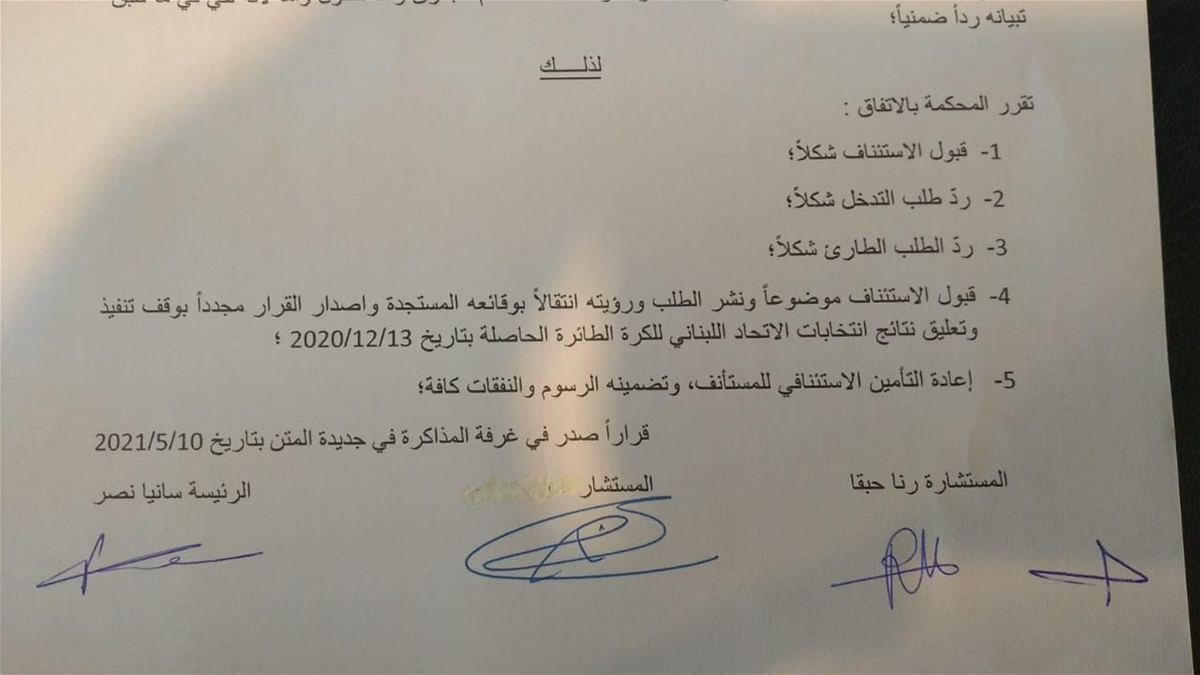 ‎صدر عن محكمة الإستئناف في جديدة المتن ظهر اليوم قرار موقع بإسم الرئيسة سانيا نصر وقضى بوقف تنفيذ وتعليق نتائج إنتخابات الإتحاد اللبناني للكرة الطائرة التي جرت في شهر كانون الأول الفائت.