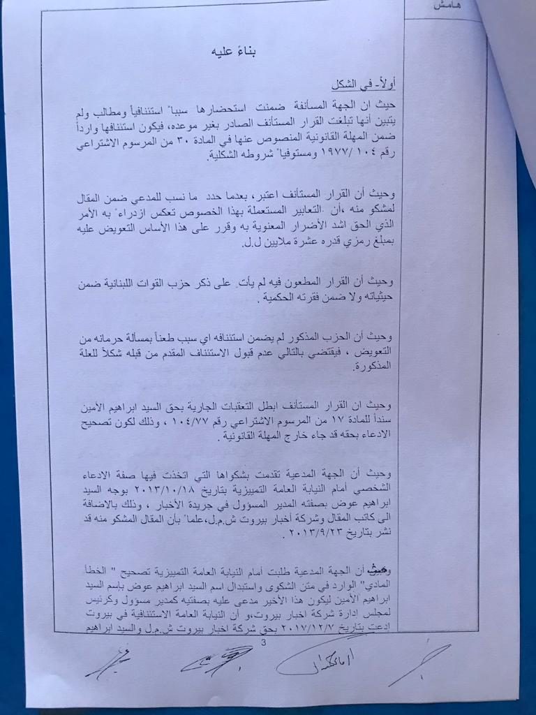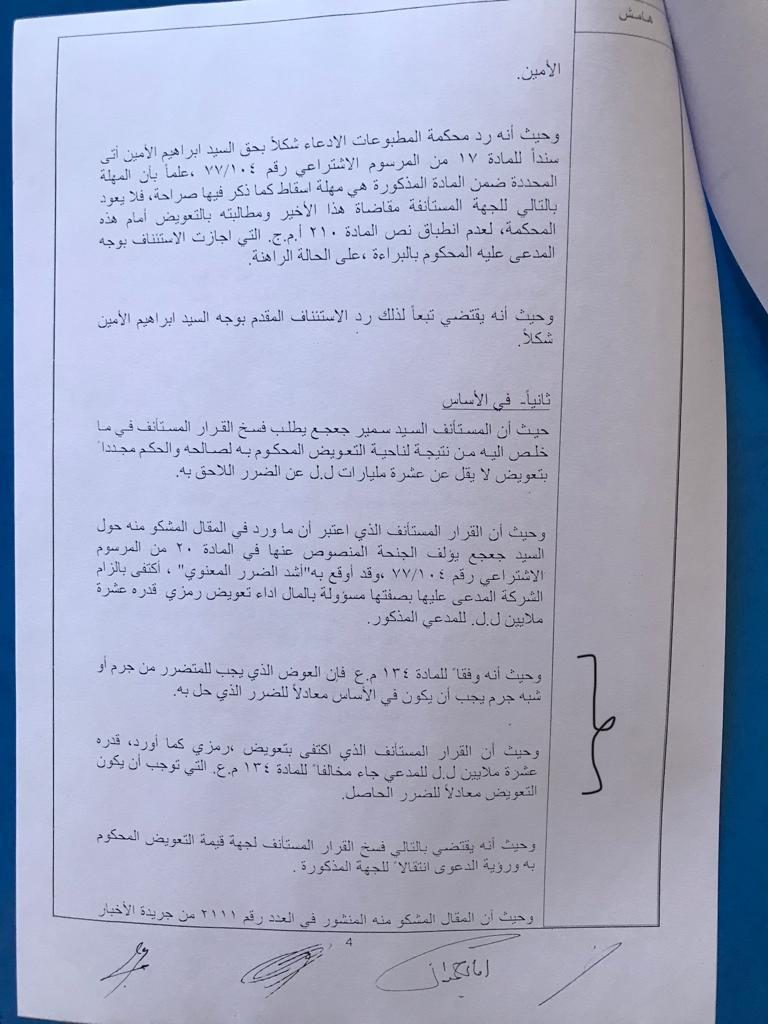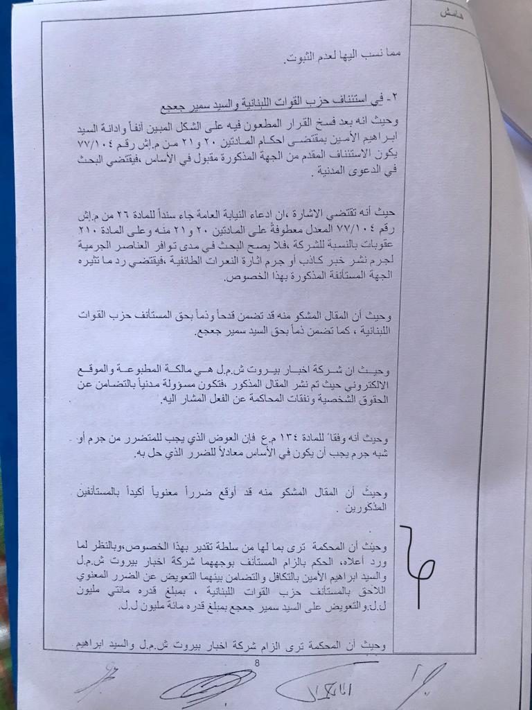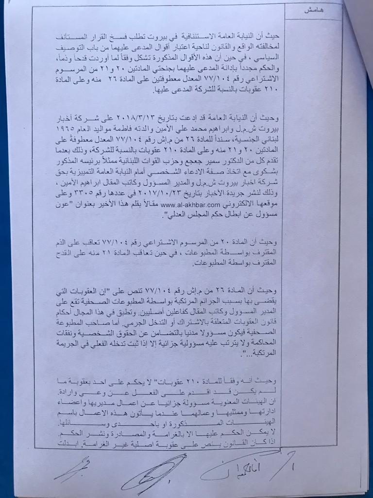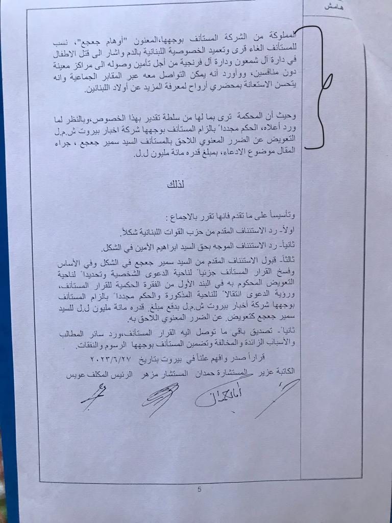 “وحيث أن ما نسبه المقال إلى السيد سمير جعجع من قيامه بمجزرة اهدن من شأنه النيل من شرفه وكرامته ويشكل العنصر المادي لجرم الذم…”