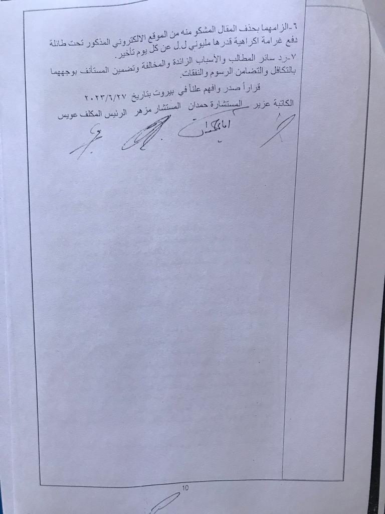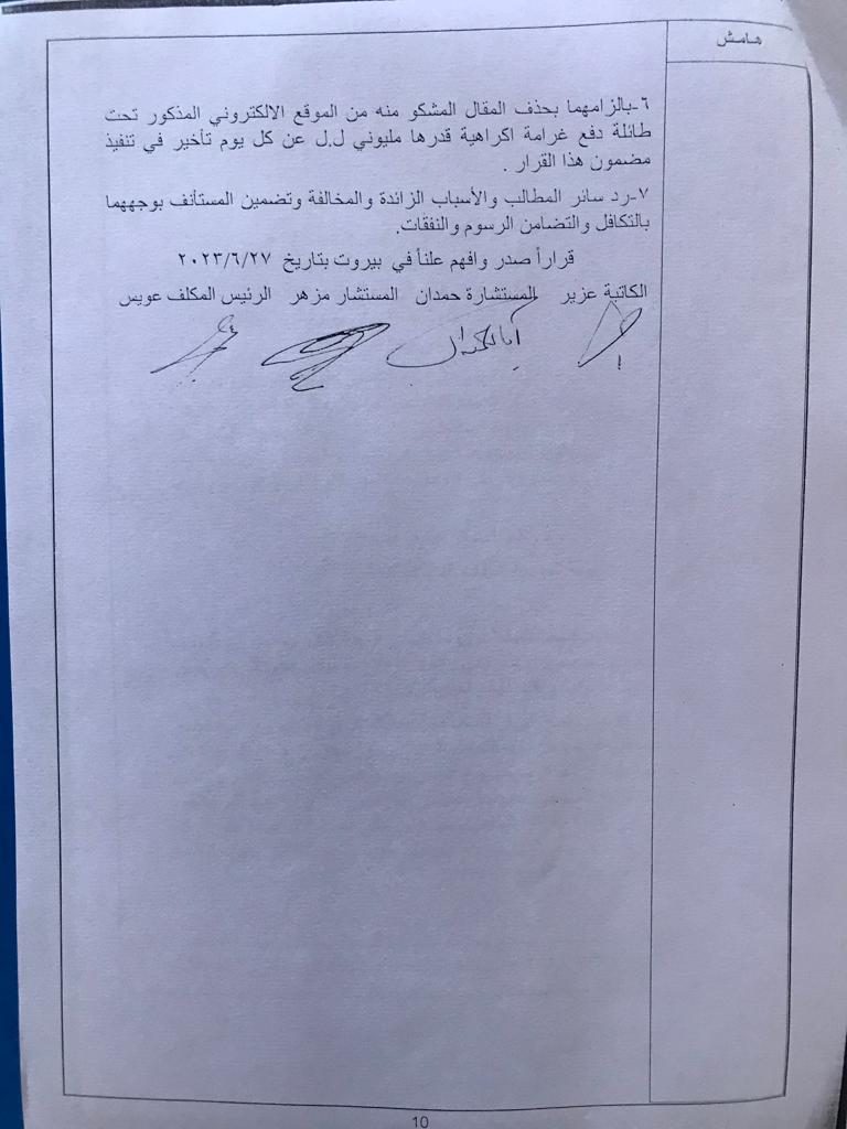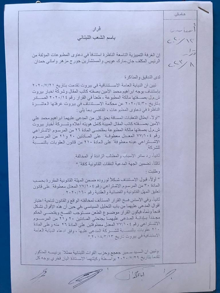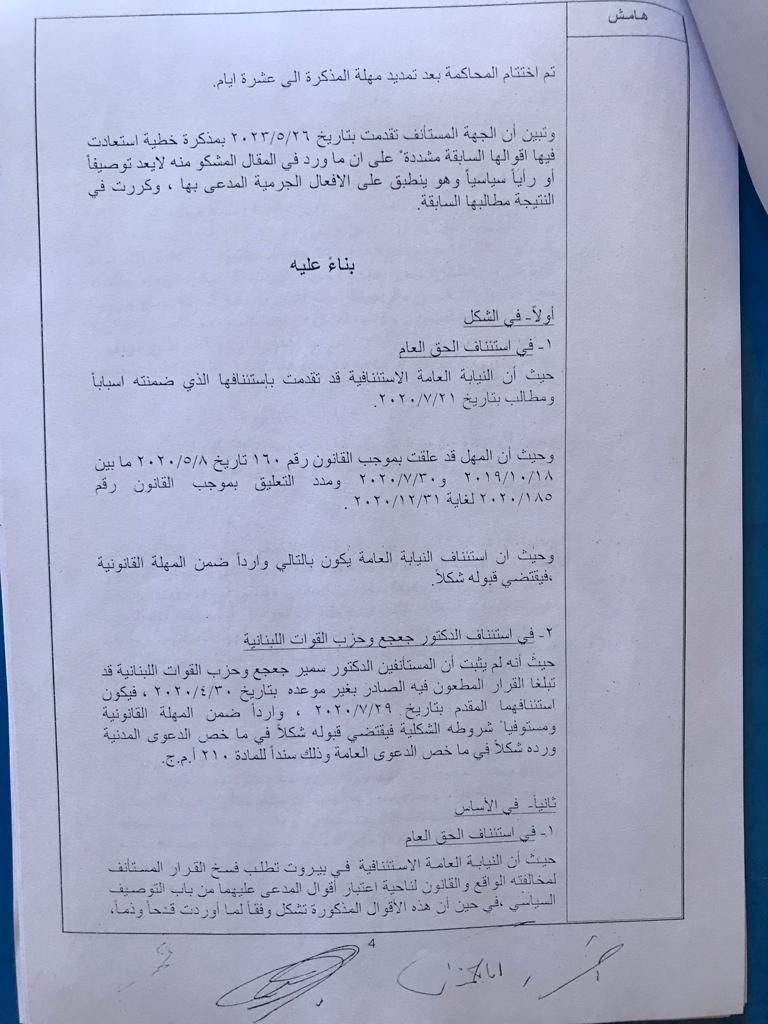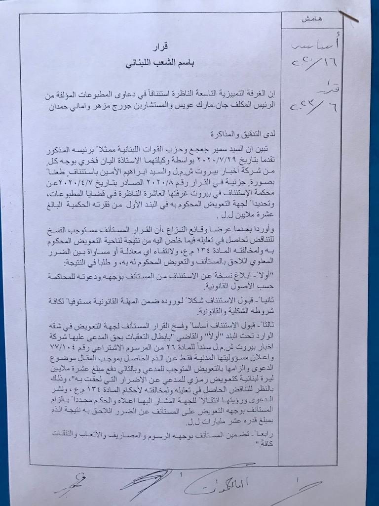 “وحيث أن ما نسبه المقال إلى السيد سمير جعجع من قيامه بمجزرة اهدن من شأنه النيل من شرفه وكرامته ويشكل العنصر المادي لجرم الذم…”