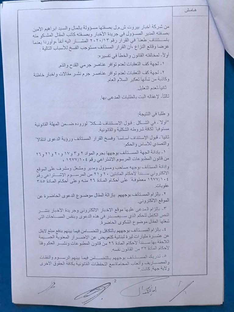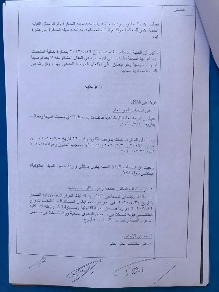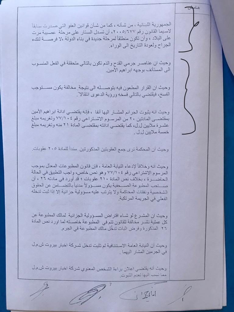 5- إن أحكام المجلس العدلي وقانون العفو قد أسدلوا الستار على مرحلة عصيبة مرّت بها البلاد، وبالتالي لا يجوز نشر ما يرجع البلاد إلى تلك المرحلة؛ خاصّة لجهة ادّعائنا بجرم المادة 317 عقوبات وهو جرم إثارة النعرات.