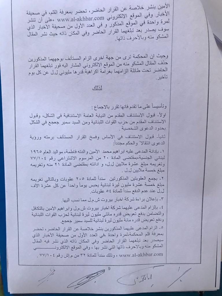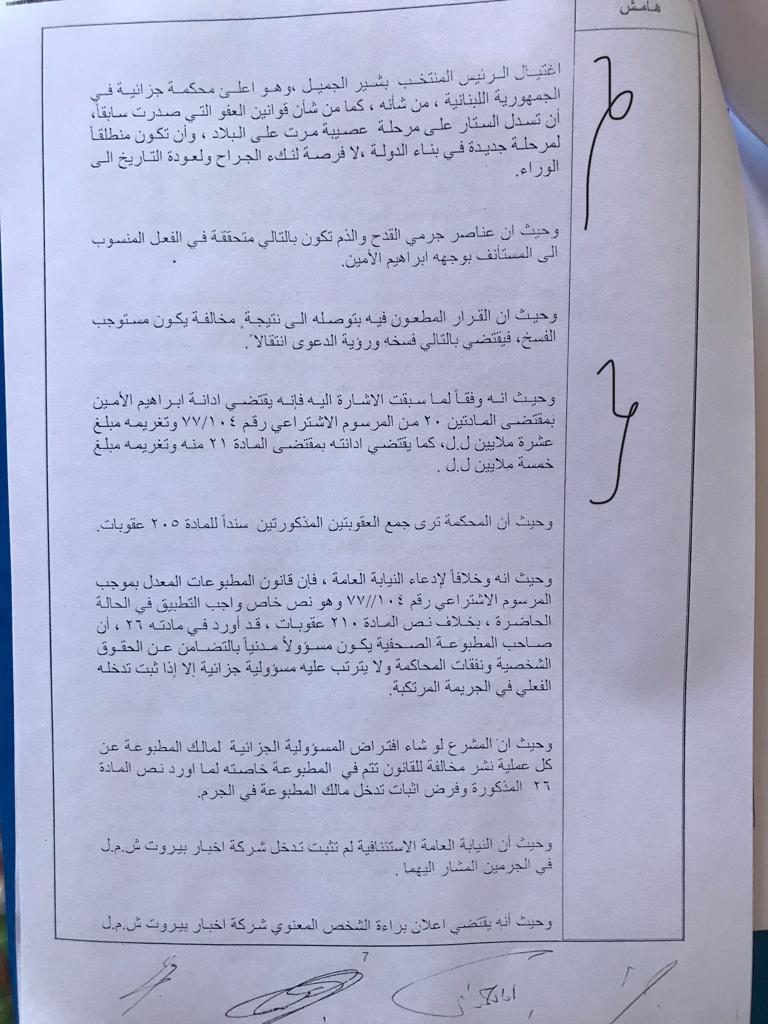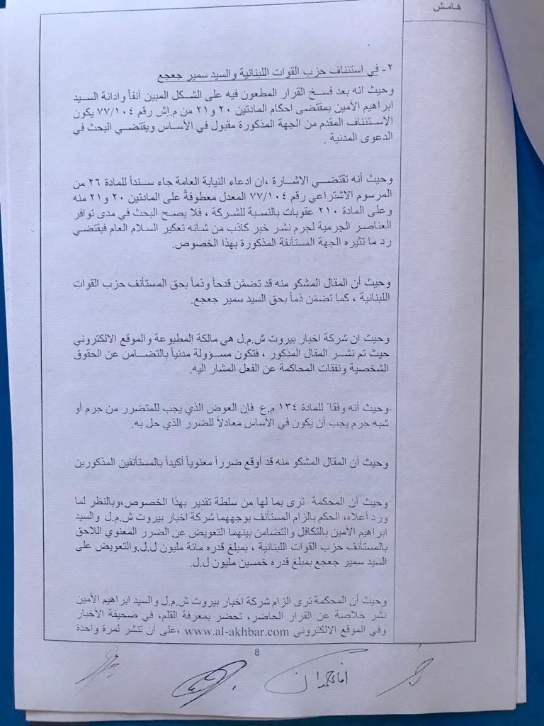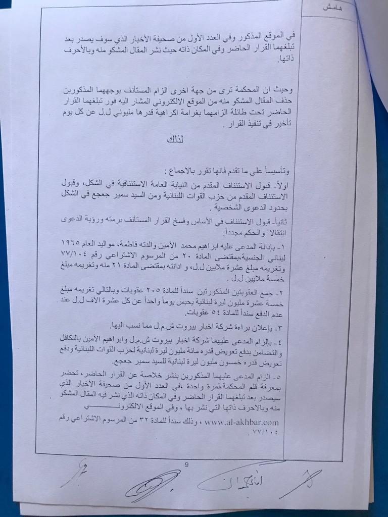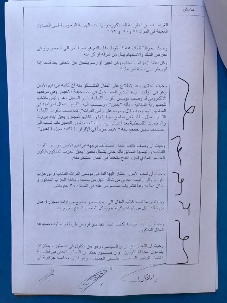 “وحيث أنّه يتبيّن بعد الاطلاع على المقال المشكو منه أن كاتبه ابراهيم الأمين وهو في الوقت عينه المدير السؤول في صحيفة الأخبار وفي موقعها الالكتروني قد وصف مؤسس القوات اللبنانية بشير الجميل وهو رئيس منتخب للجمهورية اللبنانية بأنه “خائن” “ومجرم حرب صغير” ونسب إليه الانتماء إلى “فريق الاحتلال الاسرائيلي وعملائه” وهو نسب للقوات اللبنانية حرق البلاد وتقديمها لكل غزاة الكون … وارتكابها للمجازر كما نسب اليها عادات وسلوكيات ونمط تفكير يقود البلاد إلى حرب أهلية…