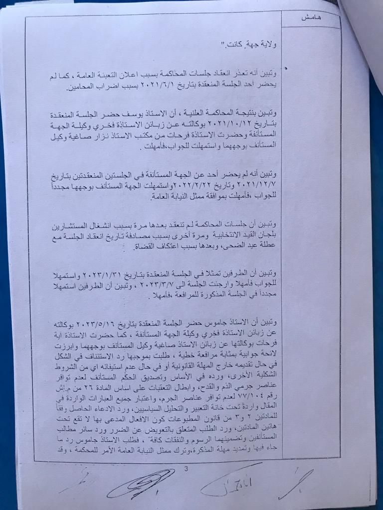 أصدرت محكمة التمييز الناظرة استئنافًا في دعاوى المطبوعات ثلاثة قرارات بتاريخ 27/6/2023، وأهم ما ورد فيها يكمن في التالي: