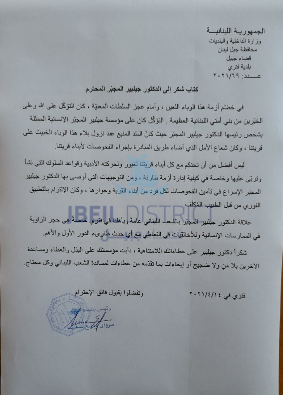 وختم : بهذا الايمان والرجاء الذي لا يخيب ، انقل الى عائلتها واقاربها ومحبيها محبة وتعازي وصلاة غبطة ابينا مار بشارة بطرس الراعي الكلي الطوبى الذي كلفني بترؤس حفلة الصلاة باسمه، كما اتقدم بإسم اخينا المطران سويف وبإسم الاباء والحاضرين وبإسمي الشخصي من افراد العائلة والاقارب بأحر التعازي ، طالبا من الرب العزاء لكم على فقدها ، ولها الراحة الابدية في الملكوت السماوي صحبة الابرار والصديقين .