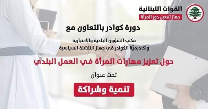 اعلنت منسقية منطقة جبيل في حزب القوات اللبنانية ان جهاز تفعيل دور المرأة ينظّم بالتعاون مع مكتب الشؤون البلدية والإختيارية وأكاديمية الكوادر في جهاز التنشئة السياسية في حزب القوات اللبنانية دورة إعداد وتدريب كادرات قواتية للعمل البلدي- دفعة أولى لتعزيز مهارات المرأة في هذا الإطار وذلك تحت عنوان ” تنمية وشراكة “.