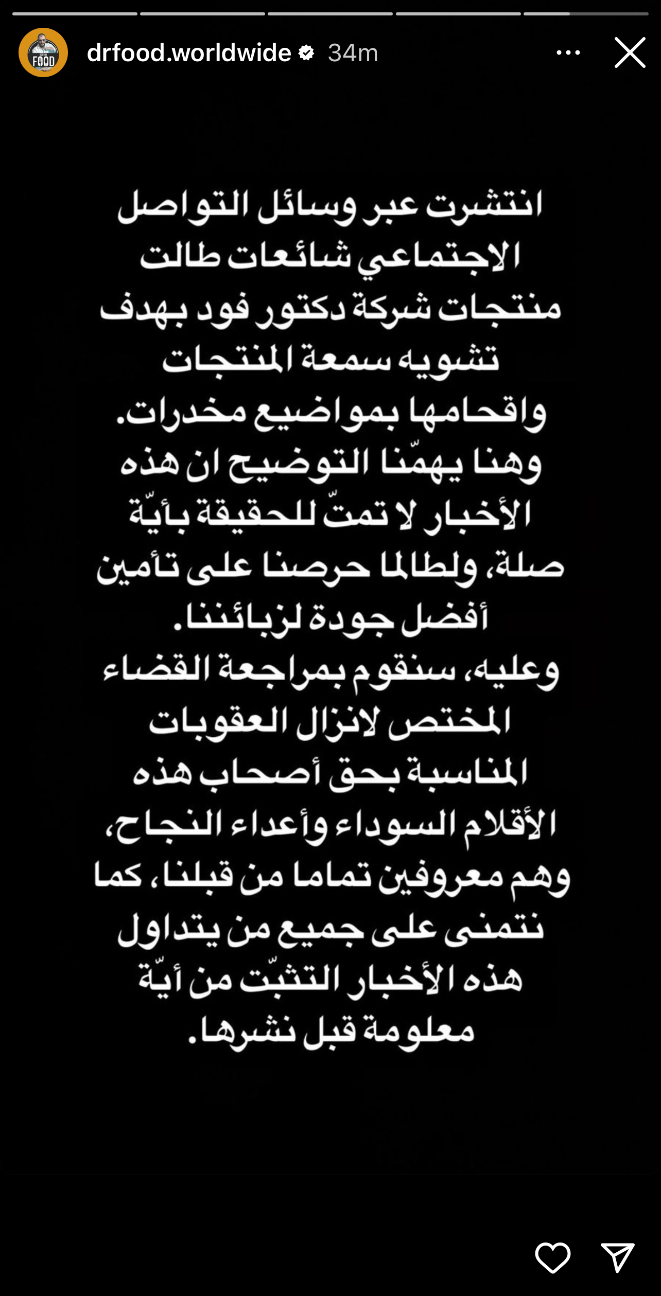 نشرت الصفحة الرسمية لدكتور فود عبر حسابه على فيسبوك البيان التالي:” انتشرت عبر وسائل التواصل الاجتماعي شائعات طالت منتجات شركة دكتور فود بهدف تشويه سمعة المنتجات واقحامها بمواضيع مخدرات.