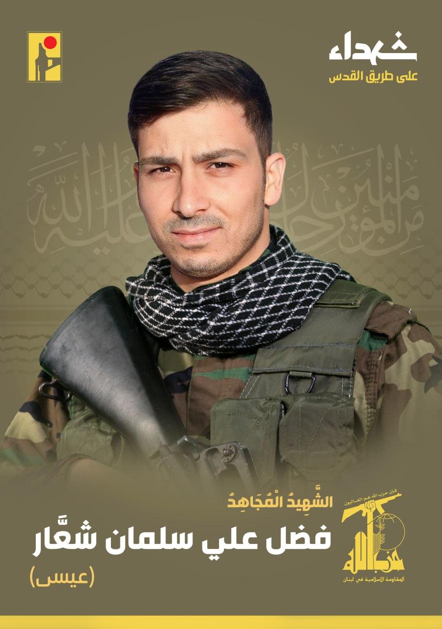 وأعلن “حزب الله” في بيان عصرا، استشهاد “فضل علي سلمان شعّار “عيسى” من بلدة النبطية الفوقا في جنوب لبنان، والذي ارتقى شهيداً على طريق القدس”.
