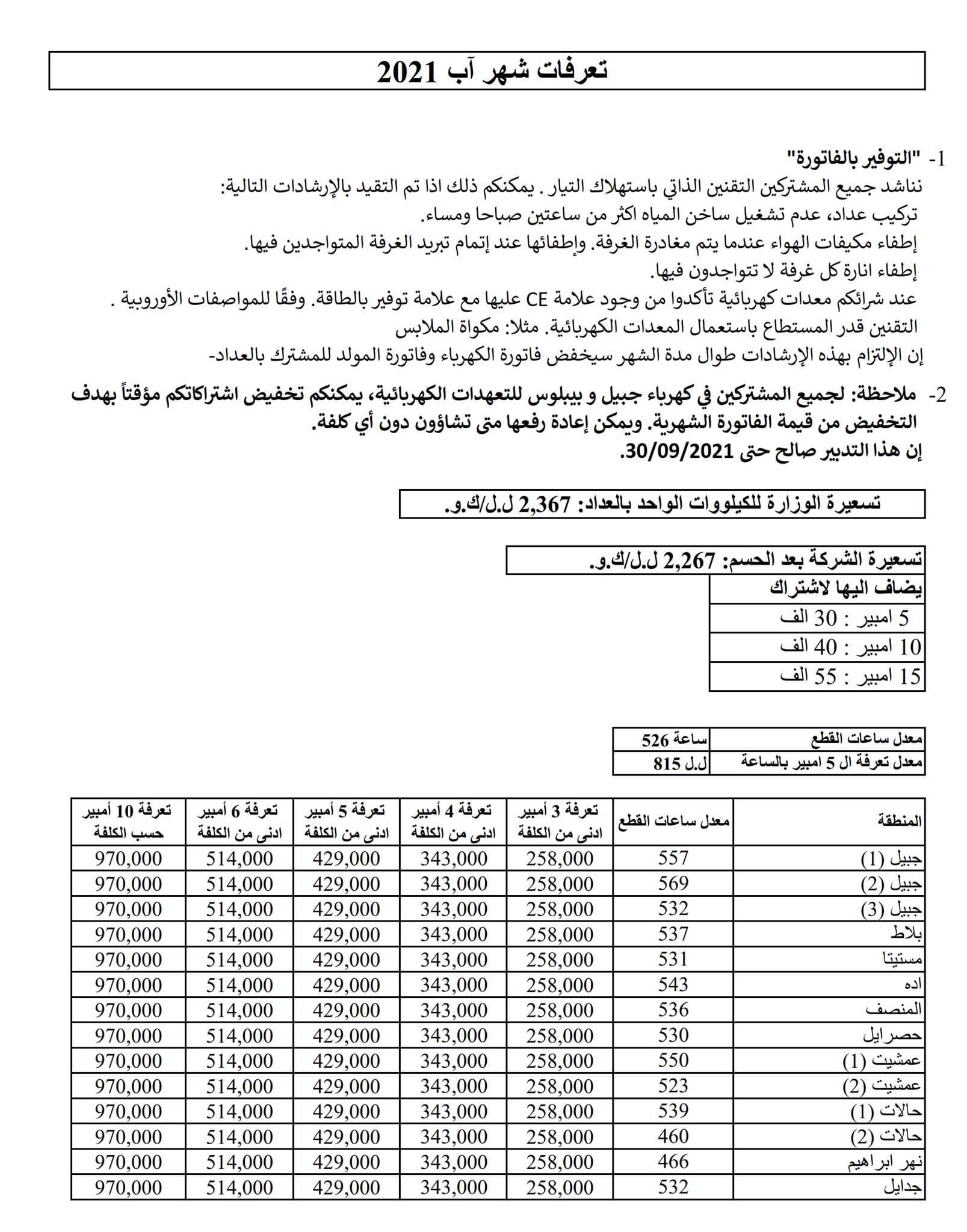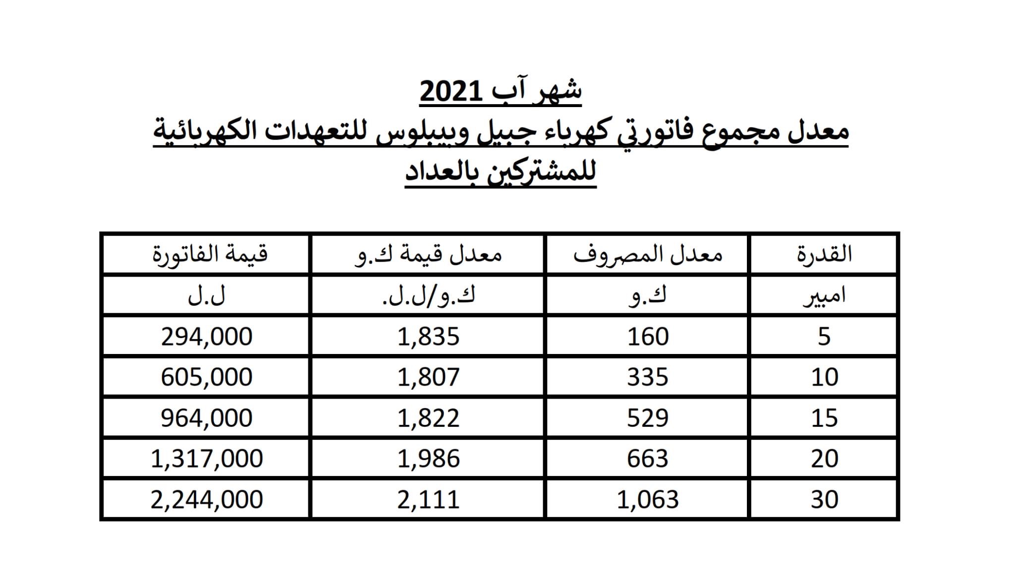 نشرت شركة كهرباء جبيل جدول أسعار فواتير إشتراكات المولدات لشهر آب.