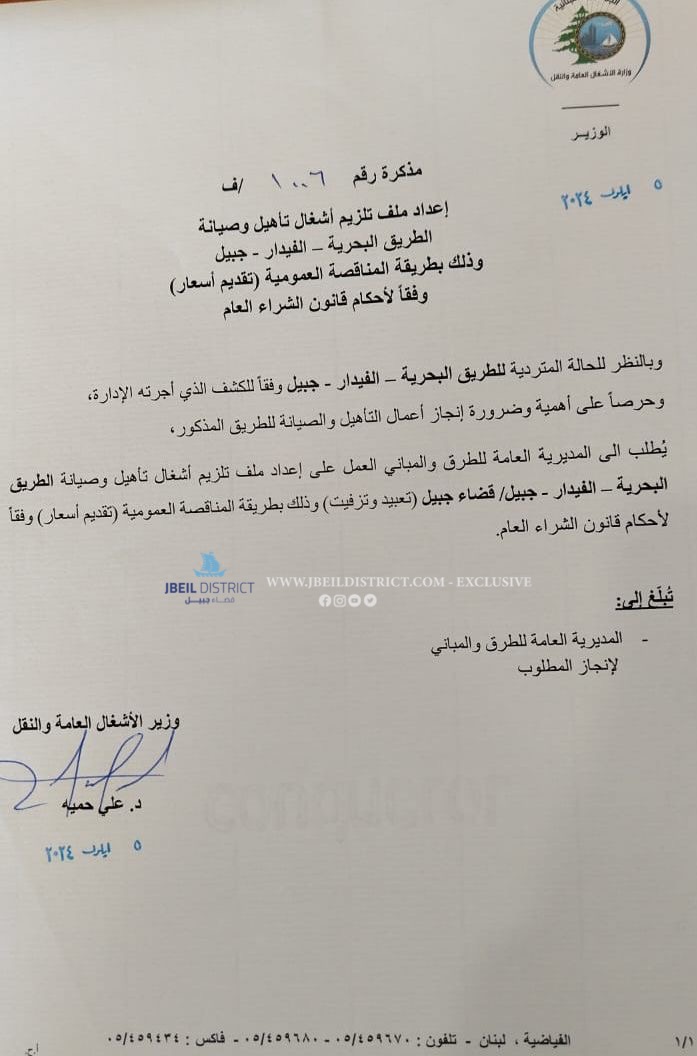 وقد تابع باسيل الملف بدقة مع وزير الأشغال العامة والنقل الحالي فايز رسامني والوزير السابق الدكتور علي حمية الذي وجه إلى المديرية العامة للطرق والمباني بضرورة الإسراع في إنجاز الإجراءات التنفيذية المطلوبة، تمهيداً لانطلاق الورشة قريباً.