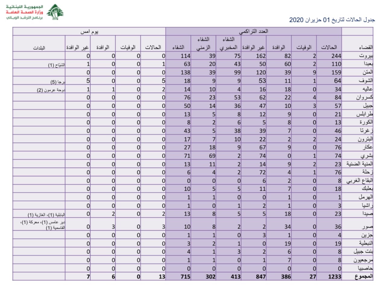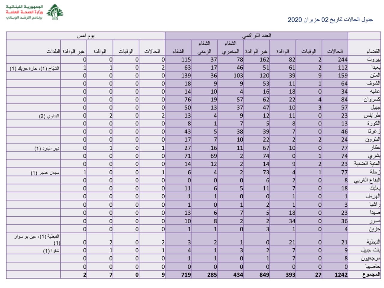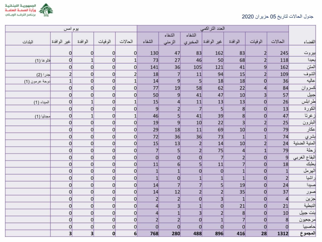 أفادت وحدة إدارة الكوارث في اتحاد بلديات قضاء صور، وبناء على تقرير رئيس طبابة قضاء صور الدكتور وسام غزال، بأنه لم يسجل اليوم أي إصابة بـcovid-19، في حين سجلت أول حالة وفاة لمصاب مسن يعاني من أمراض مزمنة. كما لم تسجل أي حالة مشتبها بها حتى الساعة.