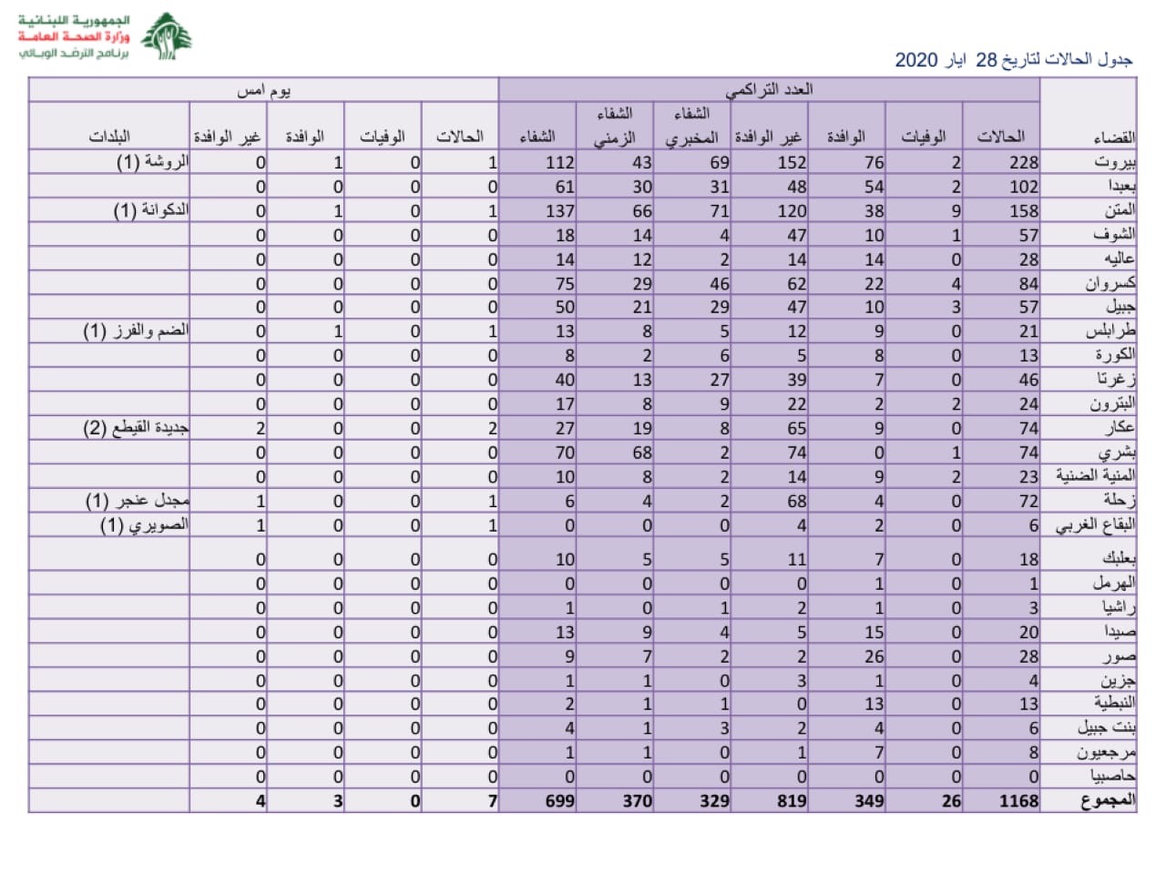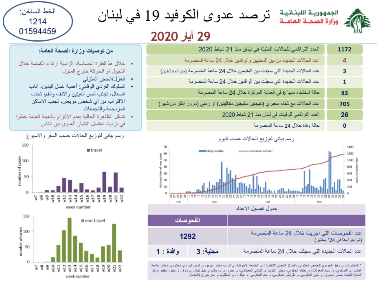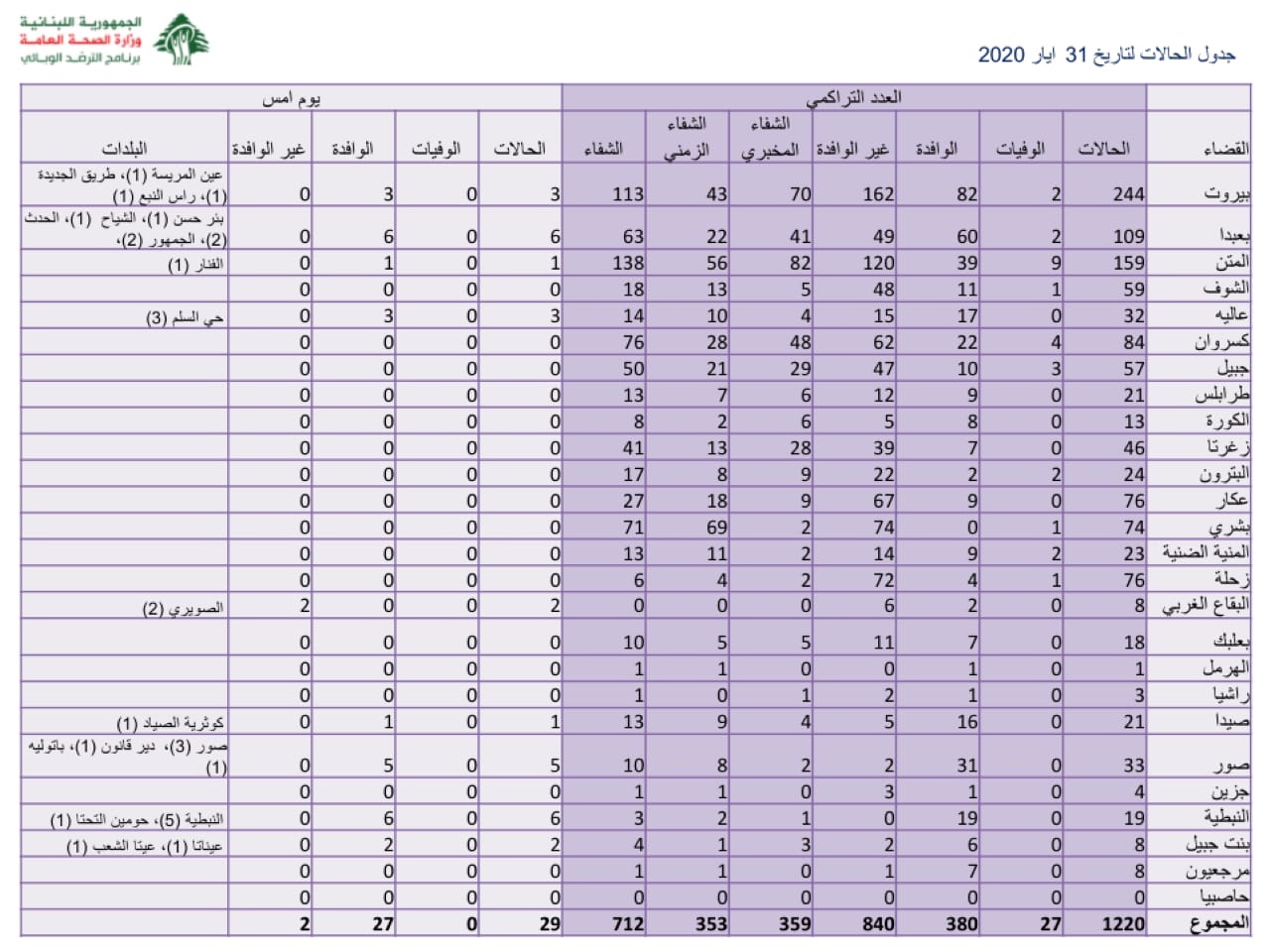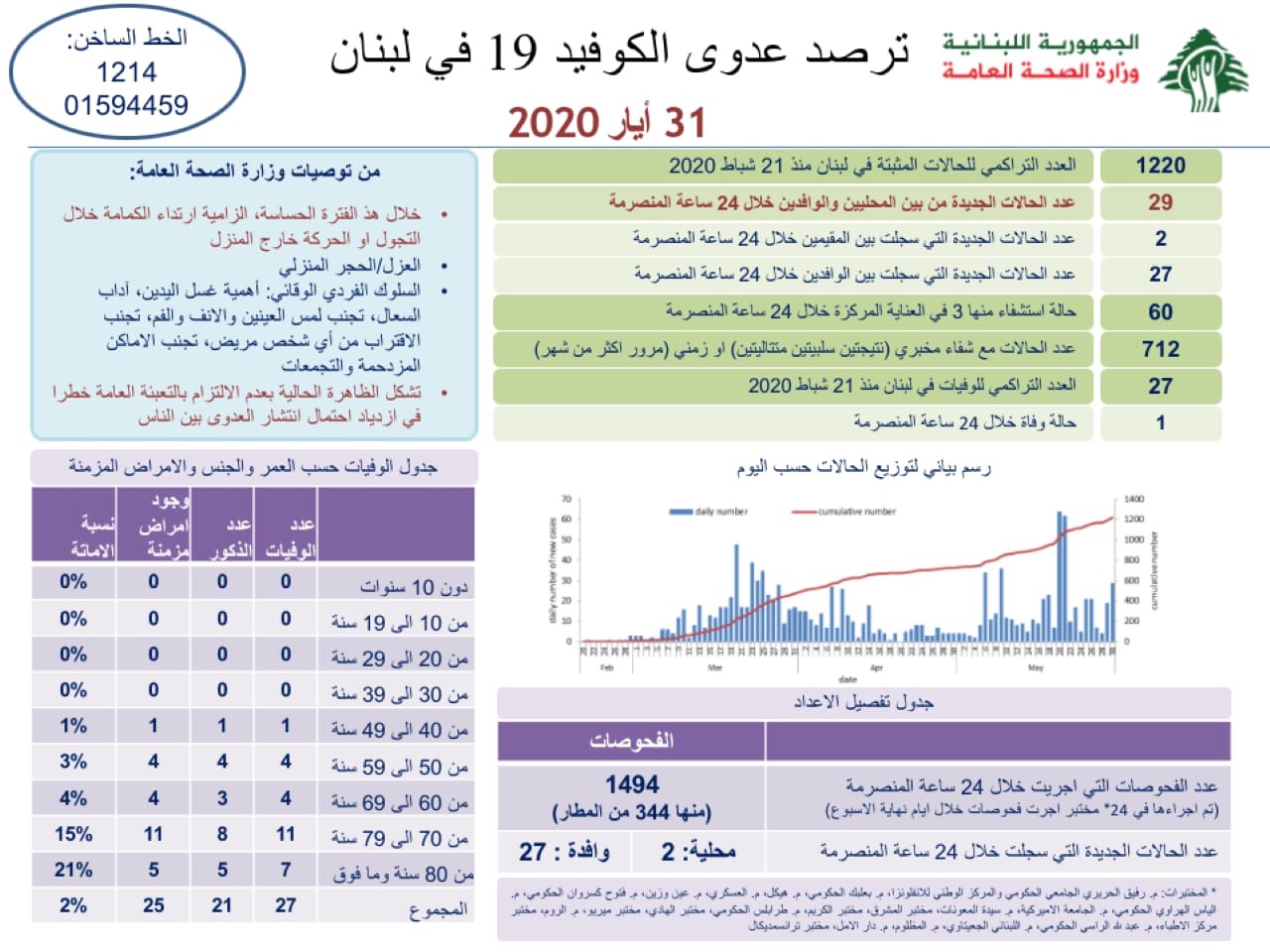 سجلت وزارة الصحة العامة 29 حالات كورونا جديدة، رفعت العدد التراكمي الى 1220 اصابة.