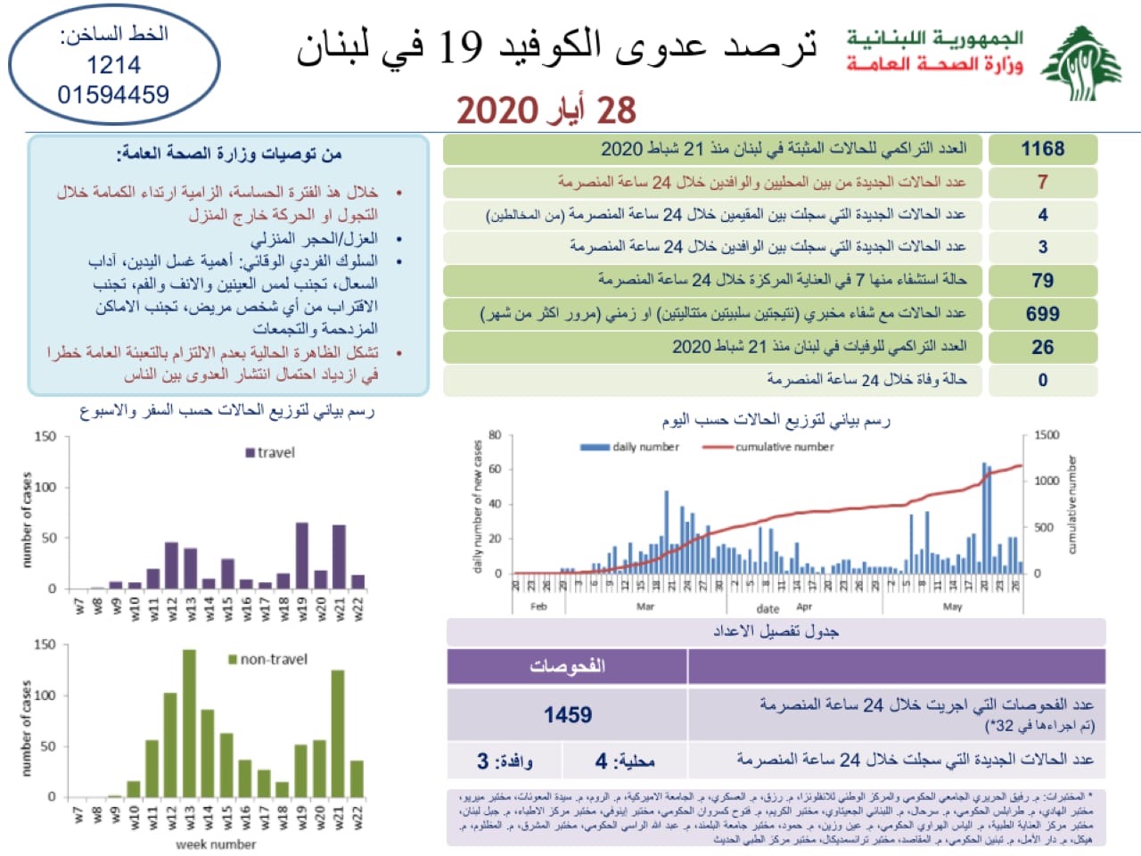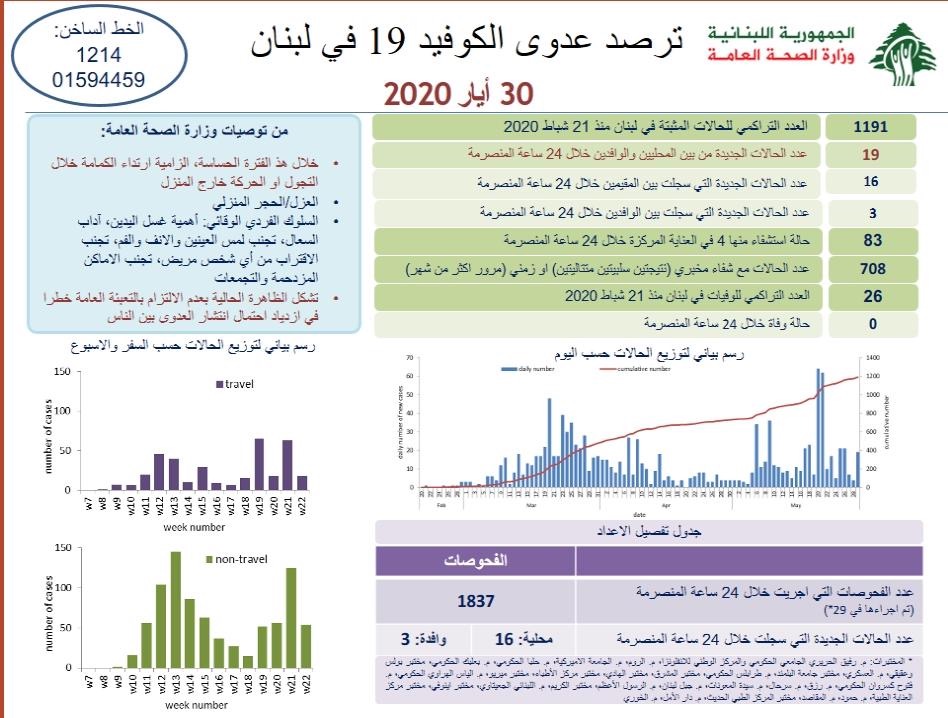 وختم: “مركز الاتصالات الخاص بفيروس الكورونا للإستجابة للطوارئ ومعرفة نتائج الفحوصات يعمل 24 ساعة في اليوم، 7 أيام في الأسبوع بما في ذلك أيام العطل الرسمية من خلال الرقم 01-820830 أو من خلال خدمة الاتصال عبر الـ WhatsApp 76-897 961”.