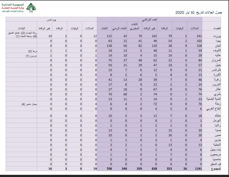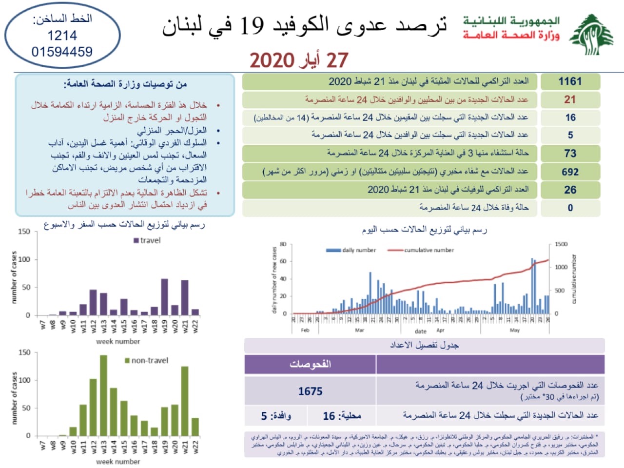 نشرت غرفة العمليات الوطنية لإدارة الكوارث تقريرها اليومي عن فيروس “كورونا”، حيث أشارت إلى وجود 1161 إصابة في لبنان بعد تسجيل 21 إصابات جديدة (16 من المقيمين و5 من الوافدين)، لافتةً إلى شفاء 692 مصابًا ووفاة 26 شخصًا.