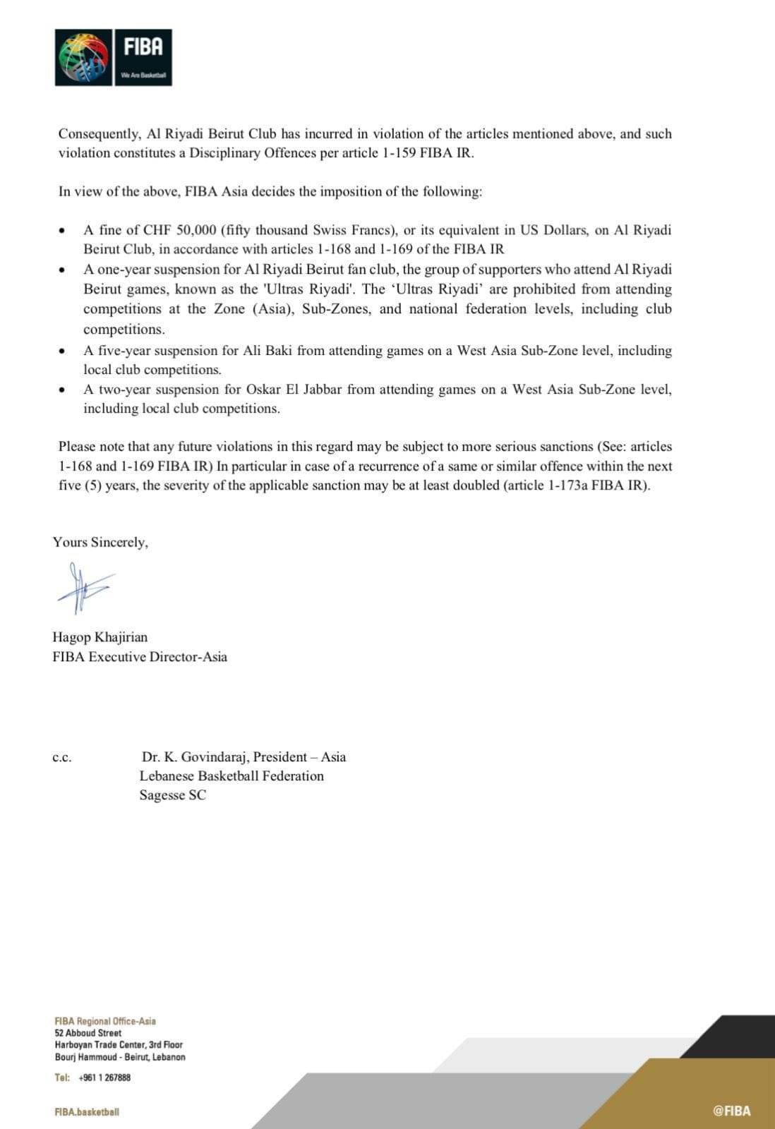 بالصورة – عقوبات بحقّ نادي الرياضي: إيقاف جمهوره لمدة سنة