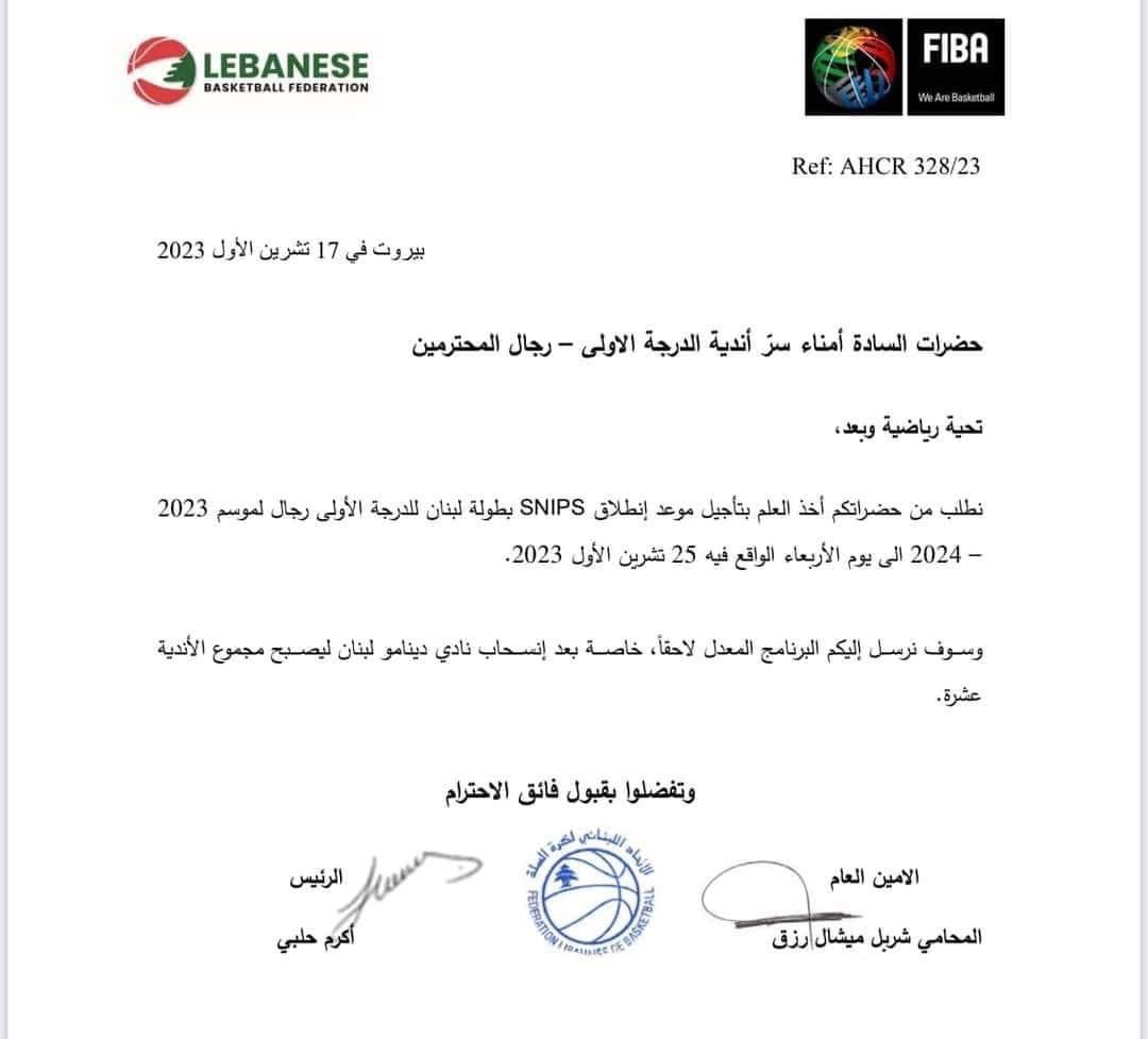 أعلن الاتحاد اللبناني لكرة السلة تأجيل موعد انطلاق بطولة لبنان للدرجة الأولى ـ رجال لموسم 2023 ـ 2024 إلى يوم الأربعاء الواقع فيه 25 تشرين الأول الجاري، بعد أن كان مقرراً أن ينطلق اليوم الأربعاء.