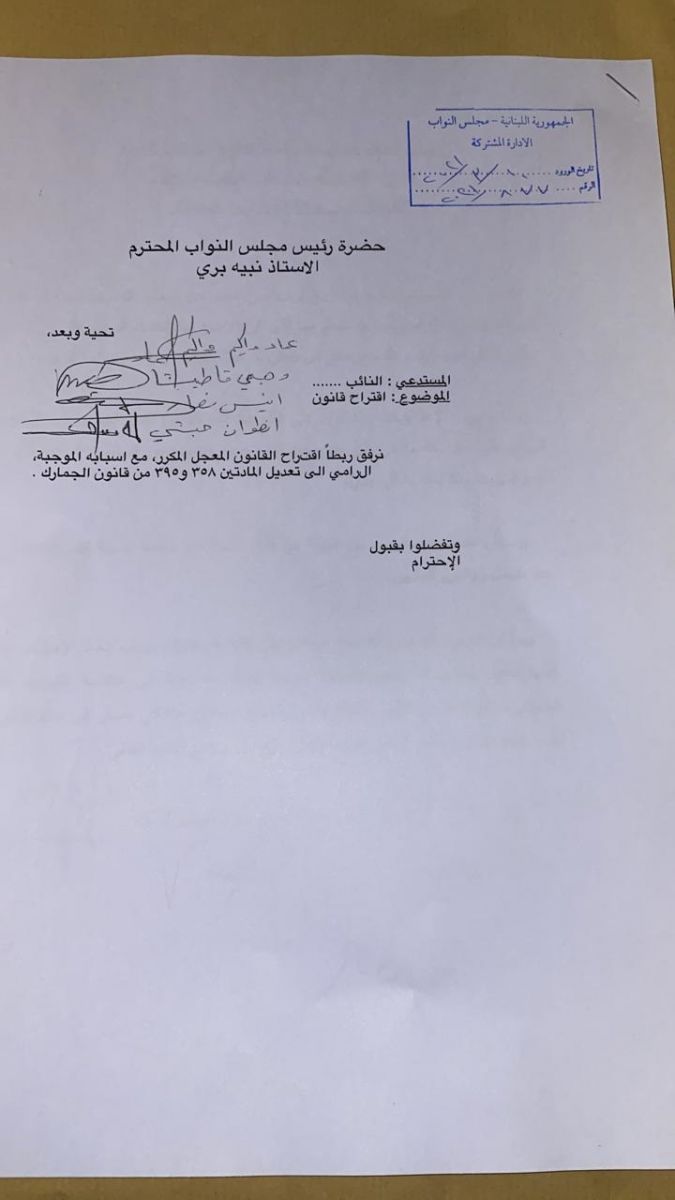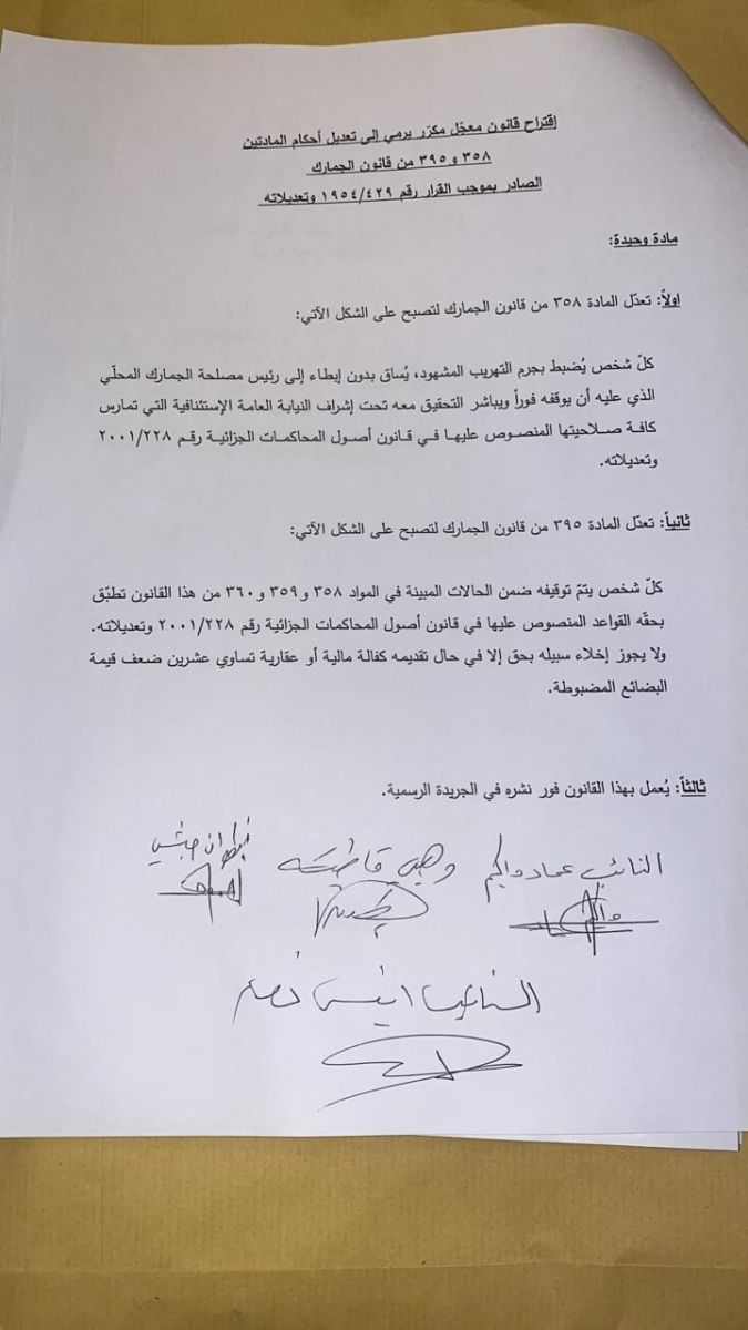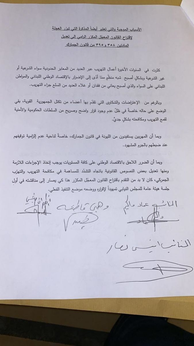 في إطار المتابعة التي يقوم بها تكتل الجمهورية القوية على المستويين القضائي والتشريعي في مكافحة التهريب الحاصل على كافة المعابر لاسيما البرية منها تقدم النواب، عماد واكيم، وهبي قاطيشه، انيس نصار وانطوان حبشي،  باقتراح قانون معجّل مكرّر يرمي إلى تعديل المادتين 358 و395 من قانون الجمارك لكون المهربين يستفيدون من الليونة في القانون المذكور خاصةً لناحية عدم إلزامية توقيفهم عند ضبطهم بالجرم المشهود.
